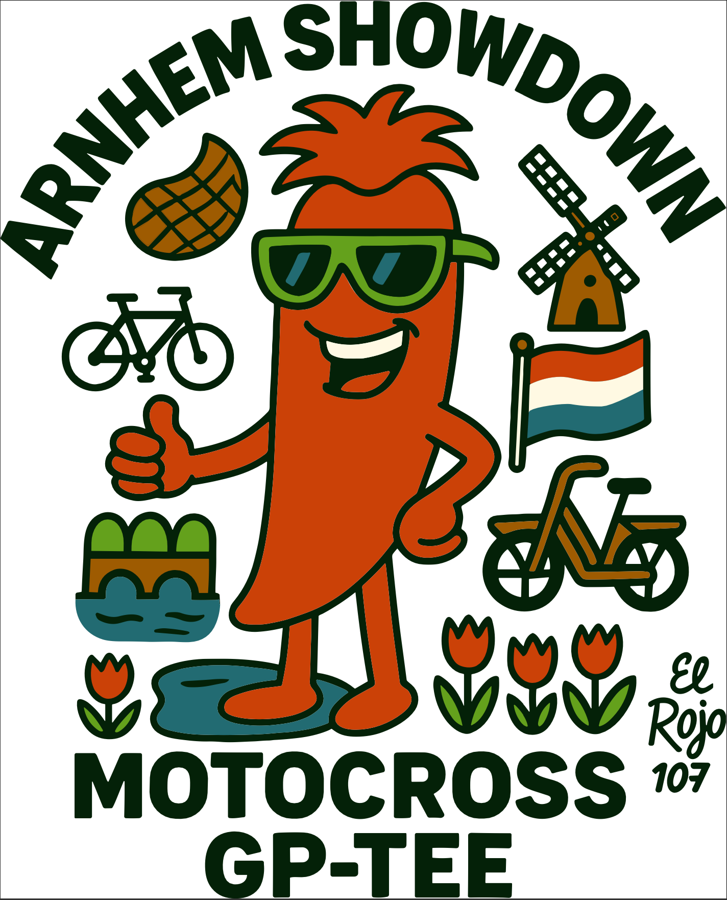 Racing my Home-GP is always special, it's been since 2021 that I raced a GP at home turf. Because of that case, but also that I like to make funny shirt I came up with the Motocross GP-Tee shirt! All inspired by the Dutch Culture but also ofcourse with the Rojo Chili in the middle!